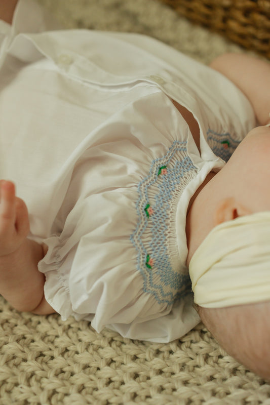 White Button Up Bishop Daygown with Blue Smocking