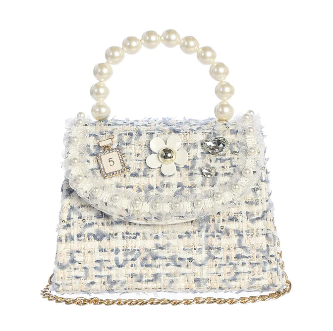 The tweed purse with pearl accents is an elegant addition to your wardrobe. Crafted from a woven blue and white tweed fabric, a pearl and embellishment design adorns the flap and the pearl handle adds a touch of sophistication.