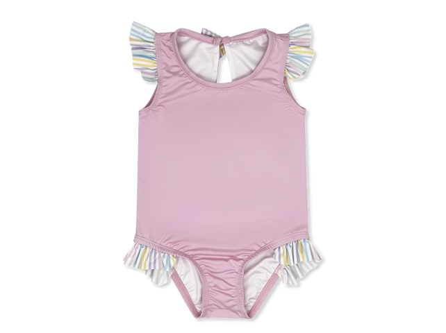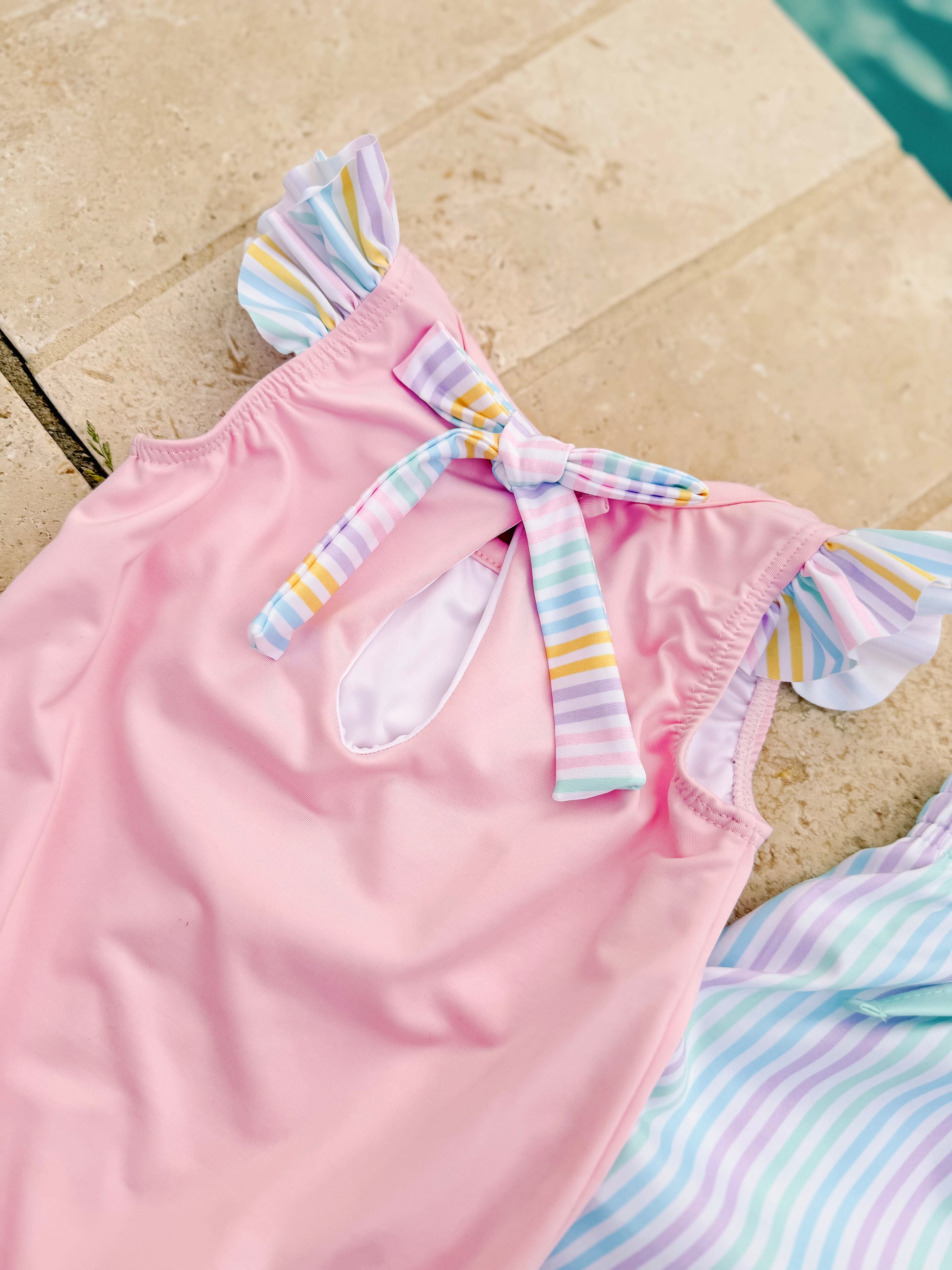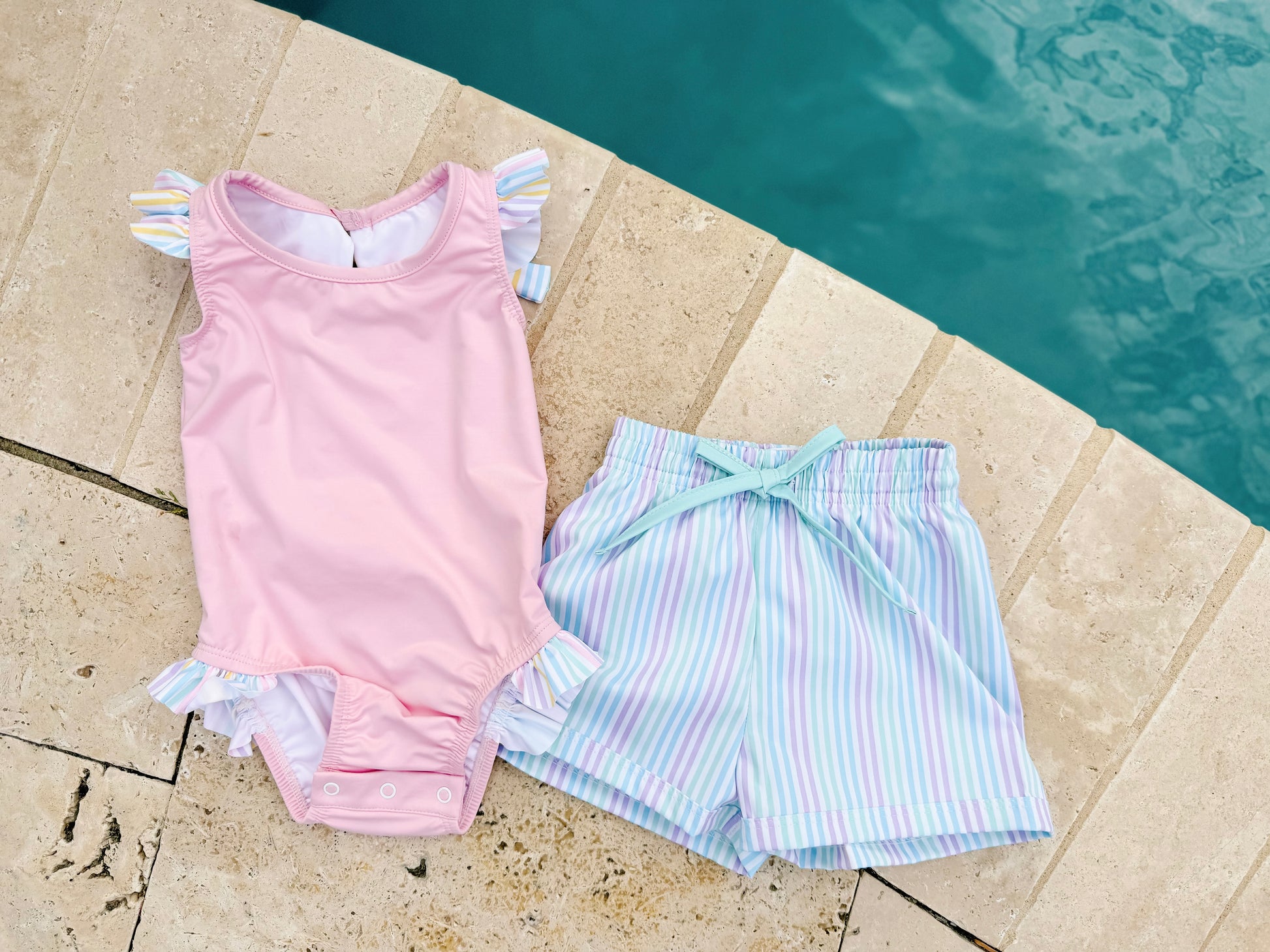 Featuring a charming Petunia Pinstripe ruffle, this swimsuit combines playful design with comfort, making it the perfect option for your little one's poolside adventures.